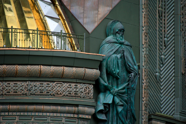 Поэтому архитектор Дмитрий Смирнов использовал стеклофибробетон, окрашенный в массе в защитный оттенок зеленого цвета – как броня. Но скульптуры бронзовые, и часть декора в интерьере тоже металлическая, с сине-голубой-эмалью, напоминающей иконку-складень XIX века. Так что и «броня» приобрела медный оттенок, будучи прокрашена по выступающим частям бронзянкой. Получилось что-то на грани между защитным металлом и скульптурой-памятником героям. Большая часть декора, мелко детализированного, выполнена из стеклофибробетонных панелей компании ОртОст-Фасад. Всё выглядит очень целостно, на первый взгляд и не отличить, где СФБ, а где бронза – издали объем кажется отлитым из цельного металла, покрытого патиной и «отполированного» на рельефных частях.