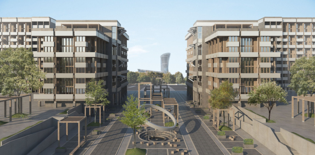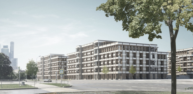 Жилые дома заполняют лакуны во фронте «сталинской» застройки, они выстроены П-образными квартальными рамками вокруг двух дворов без машин, но с одним ярусом парковки в стилобате. Предусмотрены коммерческие первые этажи, в полуподвальных ярусах – кладовки для жителей. Между домами – общественный бульвар с амфитеатром вокруг фонтана.