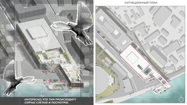 Площадку кинофестивального центра подсказал Владимир Плоткин: «Лет шесть-семь назад мы делали концепцию здания КФЦ для Никиты Михалкова на этом участке. Но проект Марии Щукиной на него не похож ничем, совпадает разве что идея подхода к зданию со стороны реки; все остальное – самостоятельная работа автора».