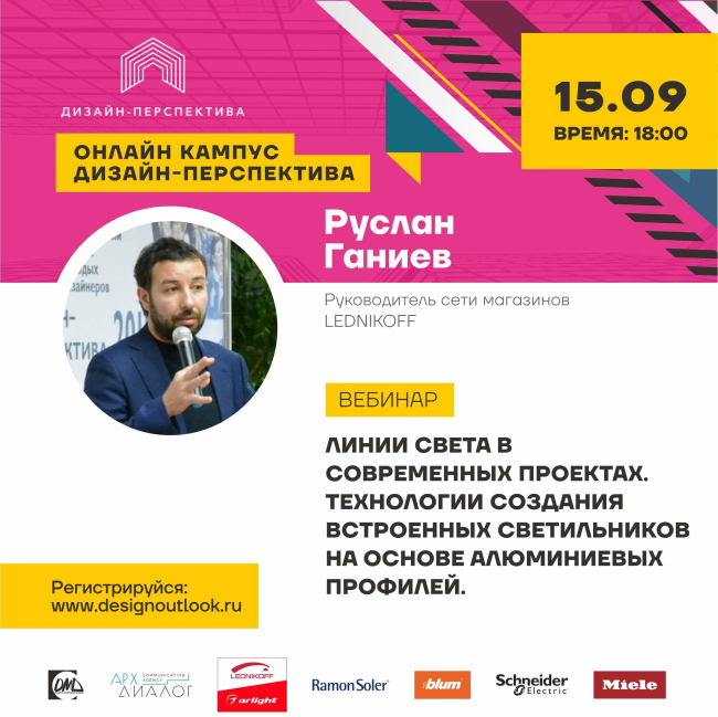 «Линии света в современных проектах. Технологии создания встроенных светильников на основе алюминиевых профилей». Вебинар пройдет 15 сентября в 18:00.