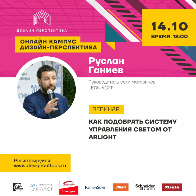 Компания Arlight приглашает вас на вебинар «Как подобрать систему управления светом от Arlight», который пройдет в рамках образовательного проекта «Онлайн кампус «Дизайн-Перспектива» . Спикер Руслан Ганиев, руководитель сети фирменных магазинов Lednikoff.