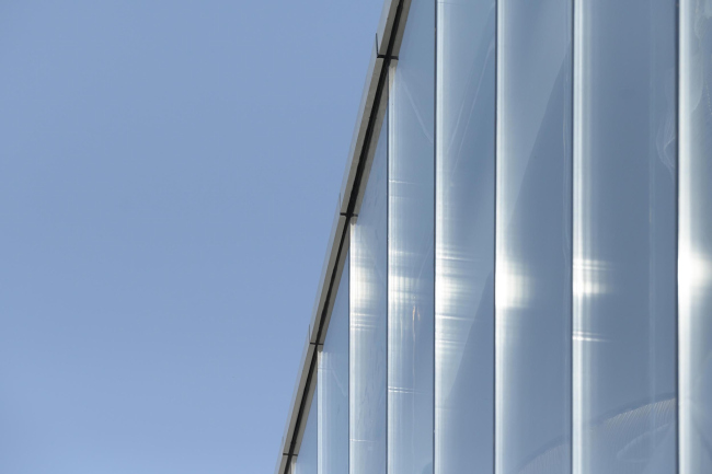 Оболочка здания покрыта чешуевидными алюминиевыми пластинами, закрученными в ритмичную спираль. Правильно расположить на фасаде 13 000 «чешуек» помогла технология BIM. В течение дня пластины под разными углами отражают солнечный свет, дополнительным «источником» рассеянного света служит бассейн, который отбрасывает блики на фасад.