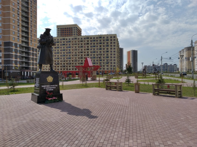 Но сквер не только мемориальный, подчеркивают авторы, он и общественный, функция двойная, здесь планируется проводить мероприятия, да и просто гулять и отдыхать. Вторая часть сквера, ближе к ЖК – именно такого общественного свойства. Здесь больше травы, здесь деревья, которые, надеемся, подрастут (пока малы, но мы и не на Садовом кольце).