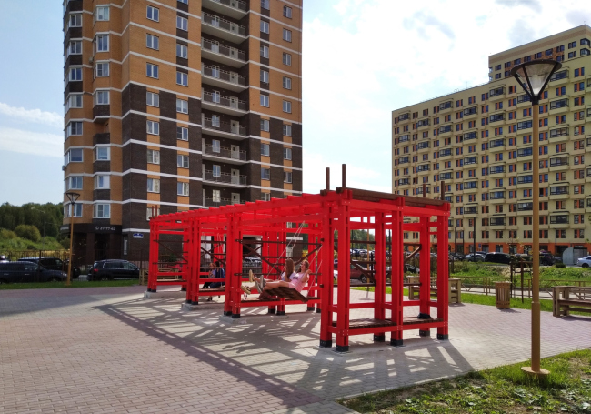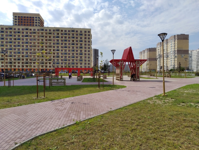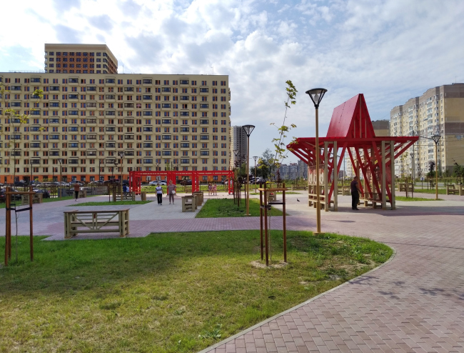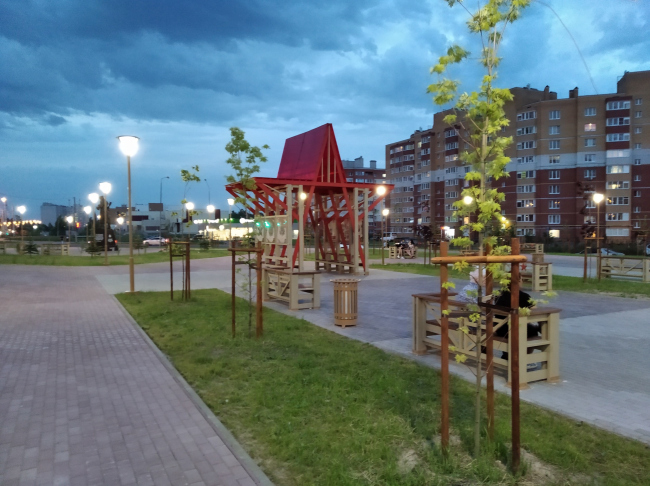В самом центре сквера – беседка «Красная звезда»: деревянный каркас, красный пластик кровли, – предполагается, что в ней можно будет не только прятаться от дождя, но и проводить мастер-классы. В дальней части, то есть ближе к домам – пергола в качелями, прямо как на Триумфальной площади – с ней, к слову сказать, возникает перекличка: там Маяковский и качели, тут командир и качели.