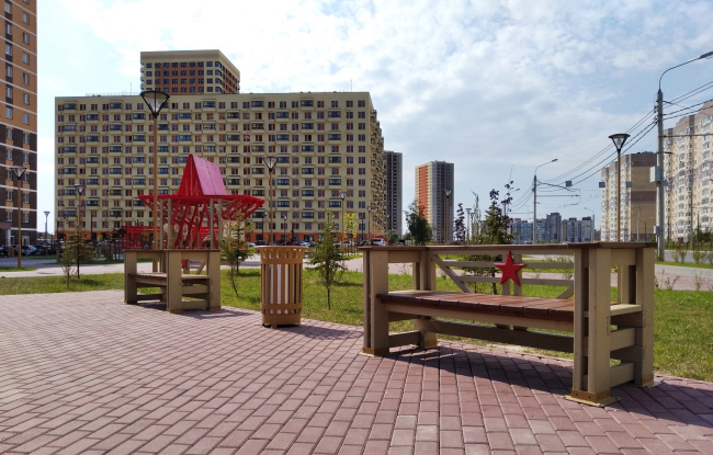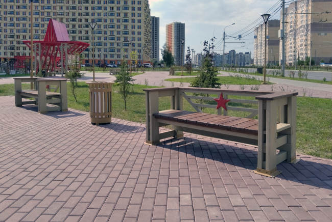 Звезду дополняют скамейки, из серии скамеек Алексея Комова со звездами под названием Ла-5, которая в 2013 стала лауреатом премии АРХИWOOD. Идея адаптирована специально для сквера Краснопивцева. Они, как и полагается в мемориальном парке, на вид не вполне анатомичные, без буржуйских изогнутых спинок, но крепкие и внушительные. «Скамейки, кстати, удобные, – возражает Алексей Комов. – Жителям они нравятся. В форме подлокотников я ориентировался на корбюзеанский стандарт».