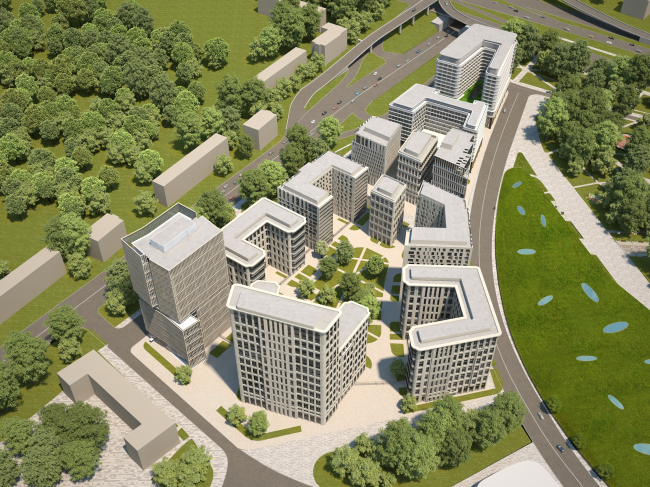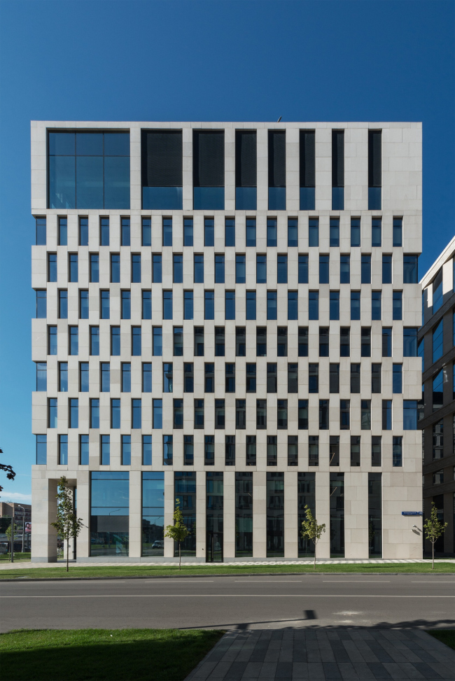Его со всех сторон окружает зелень, как деревья, так и довольно обширные лужайки: все это компенсирует местоположение на развязке двух напряженных трасс, обеспечивающих, в свою очередь, отличную транспортную доступность. Все фасады облицованы светлым известняком, что недвусмысленно указывает на высокий статус и жилья, и офисов, работая в то же время на эффект внутренней целостности нового фрагмента города. Он достаточно удален от Третьего кольца, здесь тихо, светло и уютно, особенно в солнечный день, когда здания отбрасывают друг на друга блики и рефлексы, множество солнечных зайчиков.