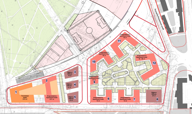 Корпуса бюро СПИЧ, представляющие классицизирующее направление, более пластичное и массивное, образовали своего рода каркас композиции, основу ее устойчивости. Отель Hyatt раскрывается к центру территории трапецией крыльев – такой же трапецией отвечает ему самый высокий (26 этажей) жилой дом на противоположном краю; силуэтом он немного напоминает голову и лапы сфинкса, что тоже довольно устойчиво. По сторонам дом «охраняют» два полуквартала-рамки, а по центральной оси от отеля к нему выстраиваются еще два небольших, похожих друг на друга, объема авторства СПИЧ.