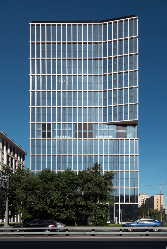 Ясность и простота фасадного рисунка подчеркивают частичный поворот объема: здание похоже на объемную головоломку в начале движения трансформации. Поворот, конечно, созвучен повороту трассы, но часть объема выглядит именно что «вынутой», «развернутой», – и ей вторит поворот плоскости в нижнем ярусе на северном фасаде со стороны Масловки под тем же углом.