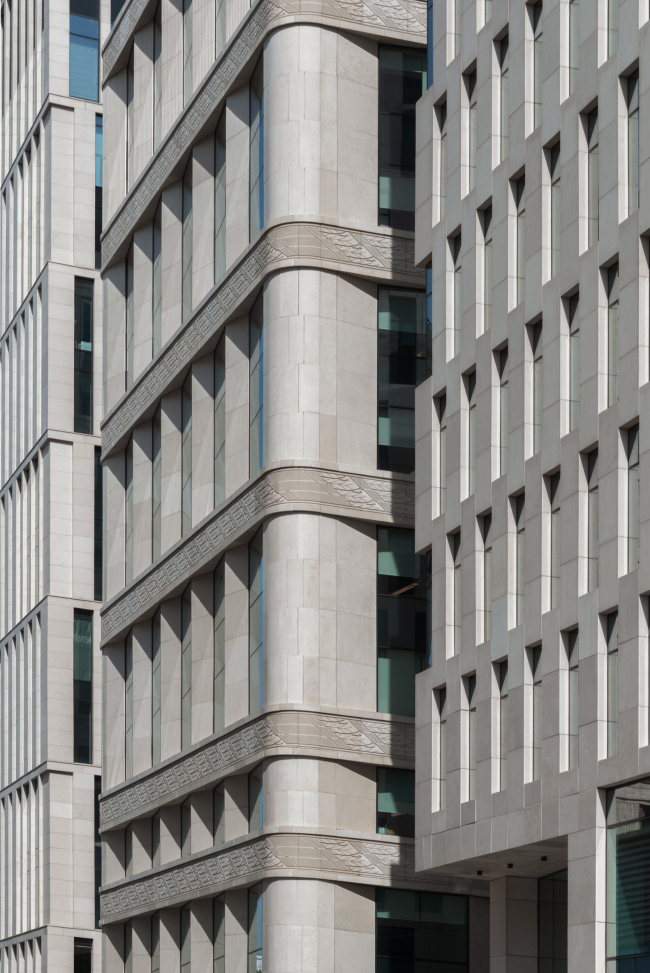 На углах камень и стекло чередуются, повинуясь ясной и почти непререкаемой внутренней логике; центральная часть здания «сплетена» последовательно, отчего выглядит до некоторой степени «вещью в себе». За оживляющую асимметрию отвечают пилонады верха и низа, цоколя и аттика – внушительные «расплетенные хвосты» основного пояса. Стереометрическая основательность восточного корпуса то и дело вызывает в памяти метафизику novecento, как будто римский EUR лишили арок и еще немного повернули, как кубик Рубика; или же расплели, как ткань.