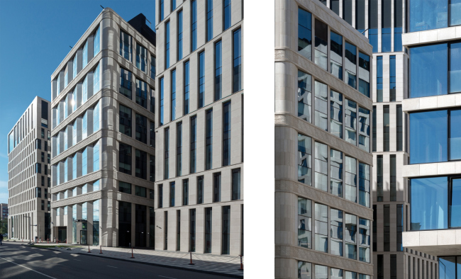 У ансамбля два автора, Сергей Чобан и Владимир Плоткин, и в рамках общей задачи они, с одной стороны, достаточно строго придерживались высотных ограничений, вертикальных пропорций рисунка фасадов, белокаменного дизайн-кода при достаточном количестве стекла. Но, с другой стороны, представили каждый свое направление – условно говоря, современную классику и современный модернизм – максимально ясным образом. И дали возможность всем желающим сравнивать их, так сказать, в пространстве, в реальной, хотя и тщательно сконструированной среде обитания.
