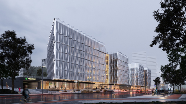 В числе требований сертификата – определенное количество парковочных мест. Поскольку рядом запланирована пешеходная территория, основную их часть разместили в стилобатном этаже, который из-за близости воды пришлось приподнять на 1,5 метра. «Архиматике» и здесь удалось добиться высокого коэффициента – 2 машины на 100 м2 офисной площади. В подземных этажах располагаются также велопарковки с душевыми, отдельные лифты для сотрудников и для доставок. «Архиматика» до мелочей продумала и «прожила» сценарий работающего в нем сотрудника: как и на чем он приезжает, где паркуется, где отдыхает во время и после рабочего дня.