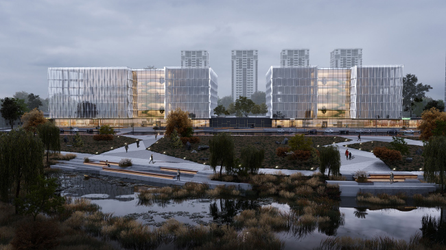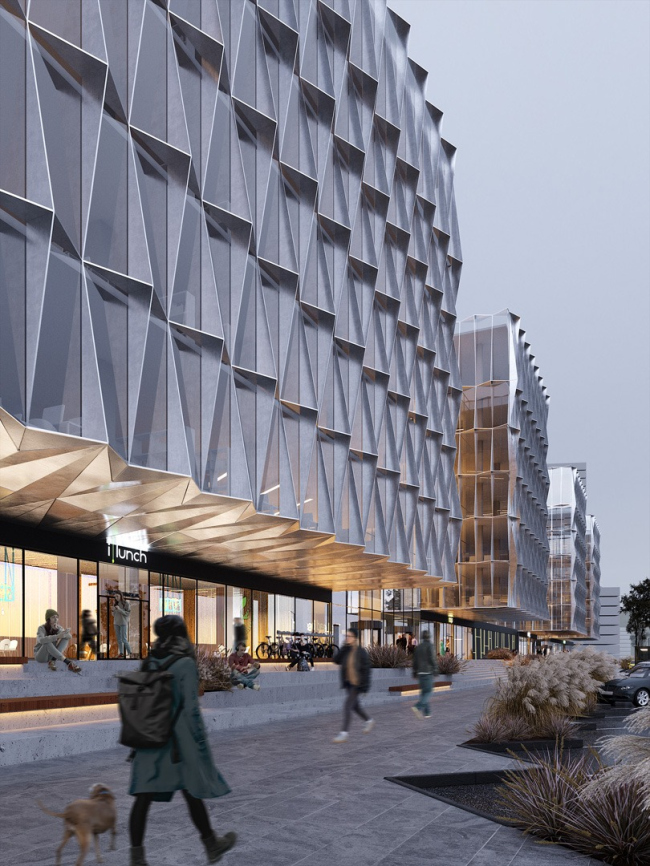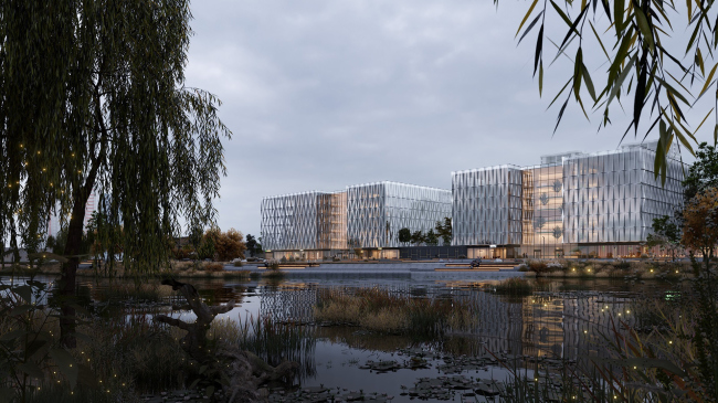 Два блока бизнес-центра соединяются стилобатом, большая часть которого предназначена для отдыха и общения сотрудников. Здесь можно встречаться, проводить презентации, вечеринки, просто дышать воздухом и наслаждаться видом на озеро. Один из вариантов фасада, к слову, – объемный, состоящий из кубов – отвергли по той причине, что сотрудники компаний или даже отделов собирались бы отдыхать на обособленных блаконах своих офисов. В итоговом же варианте потоки пересекаются и перемешиваются на общей площадке, формируется сообщество.