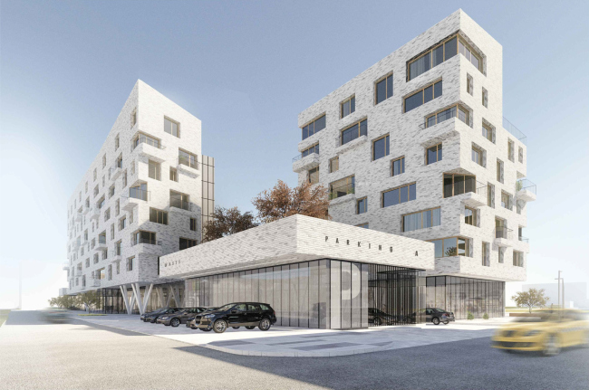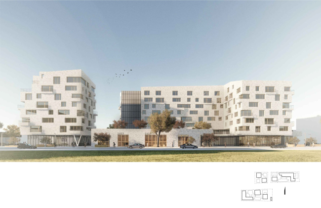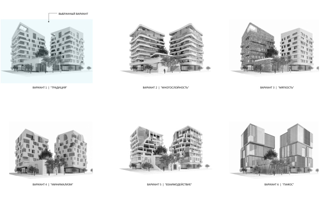 Учитывая многоголосие контекста, в котором невозможно вычленить доминирующий мотив, ОСА предлагает все три квартала своего комплекса сделать разными, что поможет избежать монотонности и добиться «сродства» с окружающей застройкой. На примере малого квартала архитекторы разработали шесть довольно сильно отличающихся фасадных тем, для каждой из которых есть свои подварианты, основанные на выборе материала. Как отмечено в презентации, бюро «удалось создать условия для свободного творчества и взвешенных решений архитектора и девелопера».