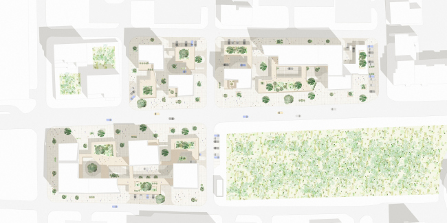 Плотная улично-дорожная сеть и малый модуль кварталов – сохранившееся напоминание о слободском прошлом этой части города. Архитекторы поддерживают это историческое измерение, разделяя участок на три небольших проницаемых квартала. «Сердцевина» комплекса – точечные дома, которые реагируют на масштаб «испанской» урбан-виллы и особняков, расположенных вдоль параллельной улицы. Два секционных дома соотносятся со зданиями большего масштаба и «уголками» закрывают квартал.