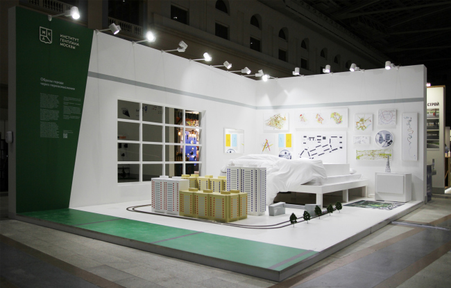 Институт Генплана Москвы, на чьем проекте проводили свой эксперимент МКА, выступил на Арх Москве со стендом, посвященным реновации и решенным как воплощение постмодернистской иллюстрации Маделон Фрисендорп к книге Рема Колхаса Delirious New York: «спальня», где в кровати под одеялом лежат два «дома», в ногах стоят еще два дома, вокруг них бегает игрушечный паровозик. Прикроватный коврик – в виде плана парка «Зарядье», на тумбочке Шуховская башня. «В форме постмодернизма мы показываем, что реновация, обновление города – не просто самостоятельное явление, а естественное продолжение идеи индустриального домостроения», – так поясняют авторы свое решение.