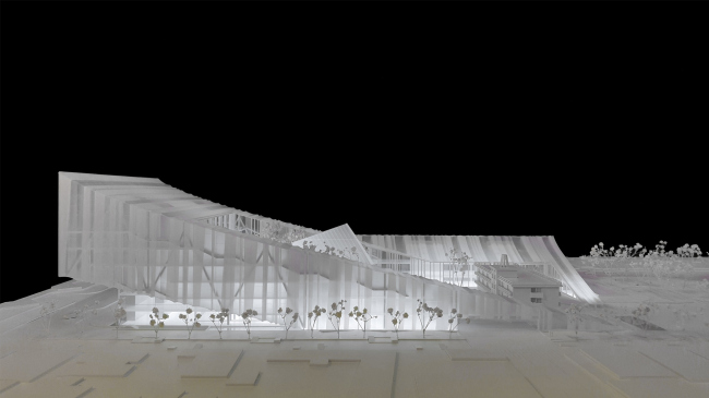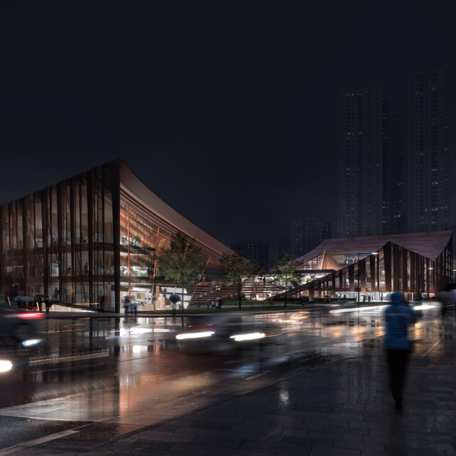 Внешние края кровель плавно приподняты, их поверхность, как и поверхность фасадов, покрыта неглубокими желобками разной ширины – цвет, форма, также как и изгиб кровли, авторы трактуют контекстуально, как напоминающие о традициях корейского зодчества с его изогнутыми крышами.