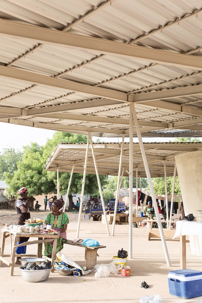Сооружение состоит из платформы-основания, легкой кровли на стройных опорах, и глинобитного магазинчика для продажи местной продукции, напоминающего традиционные зернохранилища. Туда подведена вода, есть, где присесть и отдохнуть. Вторая очередь охватила зоны с гравийным покрытием и опорами с крючками, которые можно использовать для размещения товаров или устройства навеса.