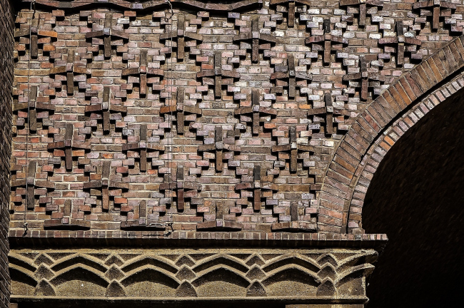 Поверхности фасадов кажутся живыми: на плоских участках использована нарядная бранденбургская кладка (два ложка – тычок), на первом этаже кирпич подчеркивает «контрфорсы», а выше из него сложены звезды, ромбовидные и кристаллические решетчатые узоры.