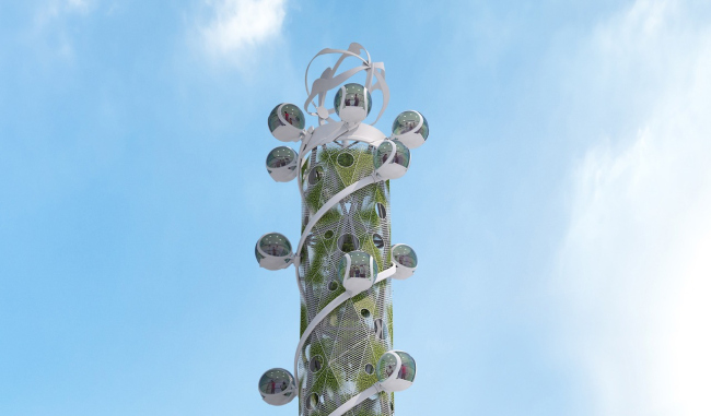 Технология позволит пассажирским кабинкам при движении вниз генерировать и аккумулировать электричество – примерно так эта система работает в электромобилях . Отметим, что кабинки двигаются не вверх-вниз, а по спирали, расширяя тем самым доступный для экскурсантов угол обзора до 360°. Ветрогенератор, венчающий башню, и солнечные панели, «украшающие» навес входного портала, станут дополнительными источниками питания. Примечательно, что все компоненты сооружения будут изготовлены из вторсырья.