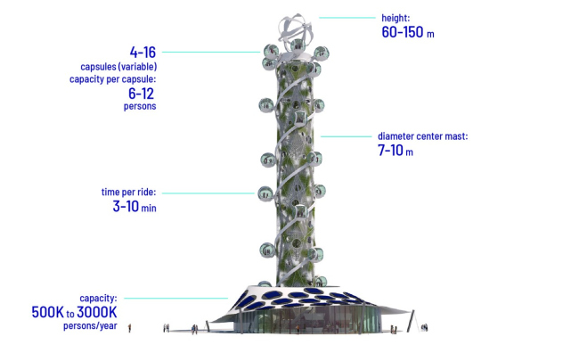 Высота башни варьируется от 60 до 150 метров, пропускная способность – от 500 тысяч до 3 млн посетителей в год, при этом единовременно сооружение способно вмещать от четырех до 16 пассажирских капсул. Итоговый вариант «комплектации» зависит от пожеланий заказчика. В перспективе аттракцион можно наделить дополнительными функциями вроде отеля или офиса.