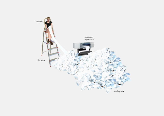 «Башня и лабиринт» – название личного блога, который с 2008 года ведет архитектор и критик Александр Раппапорт. Студенты МАРШ Ольга Вахрамеева, Арина Червякова, Евгения Удалова, Софья Дедюля, Анастасия Красикова, Софья Романовская тексты всех 5000 постов в одну ленту длиной около 7,5 километров и прямо во время фестиваля отправят ее на печать. Каждый желающий сможет взять себе кусочек.