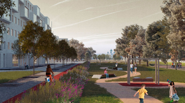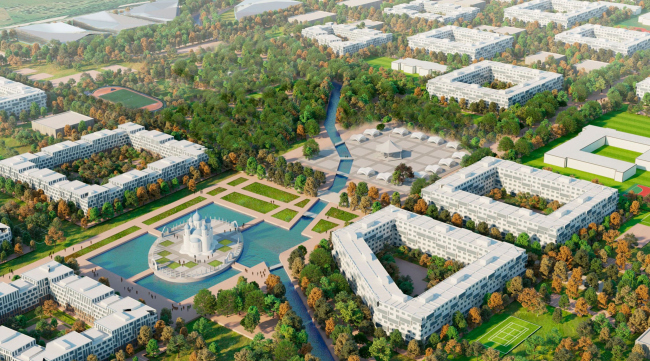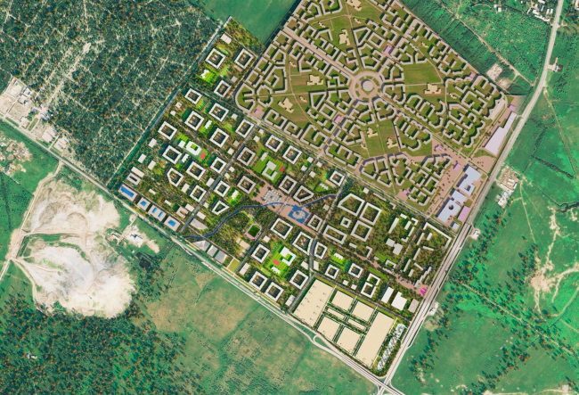 Бюро «Земцов, Кондиайн и партнеры» предложило планировку, которую многие нашли инновационной и соответствующей духу загородной жизни. Дома с закрытым периметром относительно свободно расставлены внутри кварталов, благодаря чему у жильцов есть как приватные дворы, так и достаточно обширные общие территории, которые образуют систему садов с разнообразными площадками. Два пешеходных бульвара шириной не менее 40 м – это две зеленые оси квартала, которые пересекаются на главной площади, где задуман большой парк, детский городок и храм, расположенный в центре декоративного водоема. Высота застройки – 18-21 м, на 31 000 жителей будет приходиться 9000 рабочих мест.