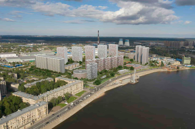 Будущий жилой комплекс эконом-класса расположится на первой линии Октябрьской набережной, но почти со всех сторон его будут окружать промышленные зоны. Корпуса высотой от 18 до 25 этажей выстраиваются по периметру участка, оставляя свободным большой двор, где расположится школа на 610 учеников и детский сад на 300 детей. В двух углах участка расположатся круглые в плане многоэтажные паркинги. На облике комплекса сказался класс жилья: в домах нет балконов и лоджий, железобетонные стены будут оштукатурены.