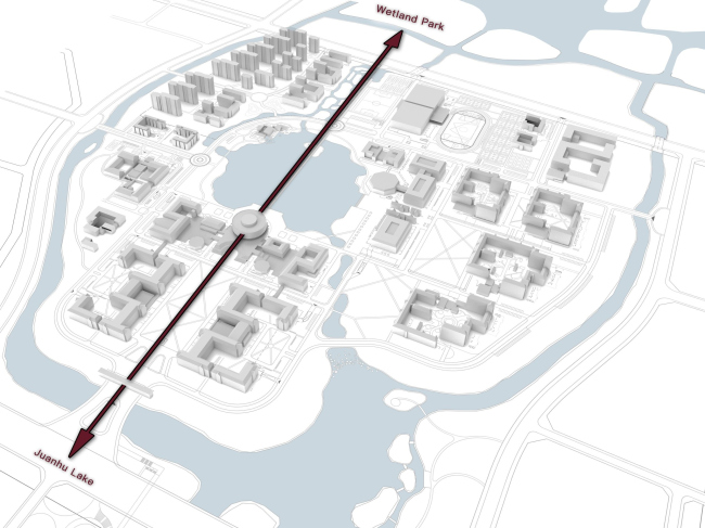 Кампус расположен на территории Международного научного парка озера Цзюаньху. Собственно озеро примыкает к нему с юга, а сам вузовский городок организован вокруг обширного пруда. С севера его ограничивает «заболоченный» парк, с востока и запада – речные протоки. Так возникают естественные границы, подчеркнутые симметричной «классической» планировкой: кампус одинаково отличается и от природного окружения, и от условно-современных научного парка и города Хайнин, где он расположен.