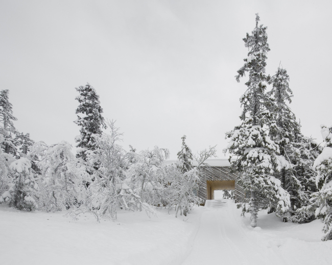 Фасад здания облицован «четвертушками» необработанных жердей, уложенных по диагонали – похожим образом норвежские фермеры монтируют изгороди вокруг своих угодий, техника называется «шигар» (skigard). Зимой снег, забивая щели в «сайдинге», придает суровому строению более дружелюбный вид.