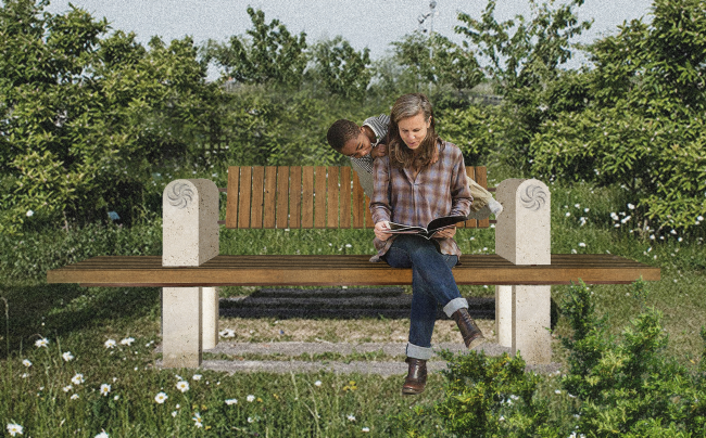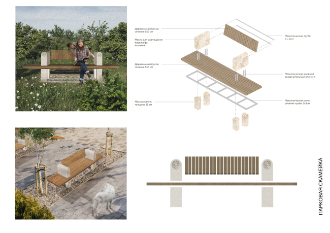 Этот проект, вероятнее всего, был выбран лучшим за соответствие всем критериям конкурсного задания: функциональность, экологичность, эргономичность, реализуемость и, конечно, эстетичность. В качестве материалов для скамьи служат дерево и камень, которые соединяются таким образом, чтобы дерево «дышало» со всех сторон. На плоских лицевых торцах каменных опор можно разместить тематические или информационные барельефы. Длина скамьи может меняться – подстраиваться под параметры конкретного участка парка.