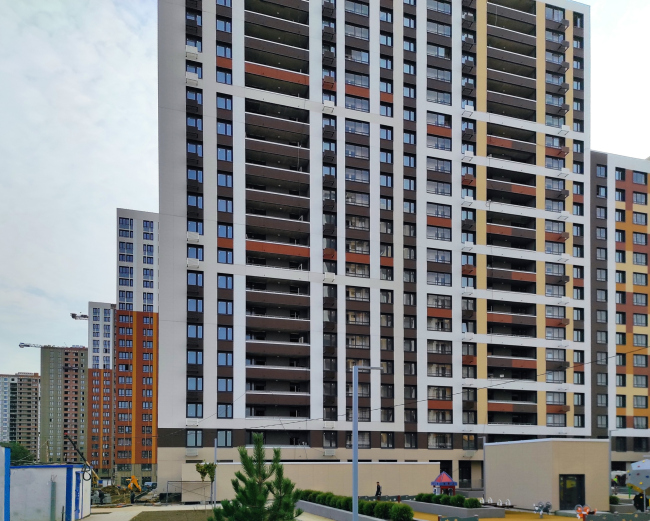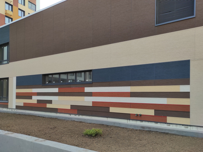 Фактура «рисовая бумага» за счет разной глубины и формы борозд достоверно имитирует естественный рельеф штукатурки, а благодаря волнообразному рисунку и продуманной системе креплений создается ощущение монолитной поверхности, которую не прерывают стыки и швы. Богатая гамма природных оттенков позволяет не только откликнуться на натуральные материалы – дерево и бетон – Инновационного центра Сколково, но и придать индивидуальности лаконичным по форме жилым корпусам. Нейтральные светлые цвета служат фоном, на котором с помощью густой терракотовый палитры создаются жизнерадостные паттерны, расставляются акценты, обособляются блоки. Многообразие приемов стало возможным благодаря сочетаемости сочных, но не броских оттенков.