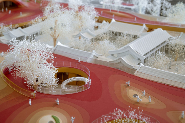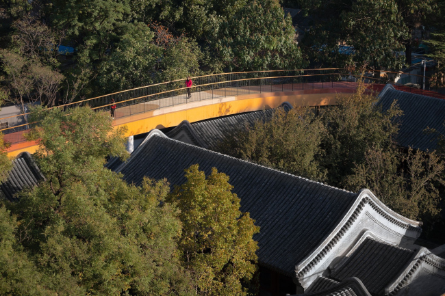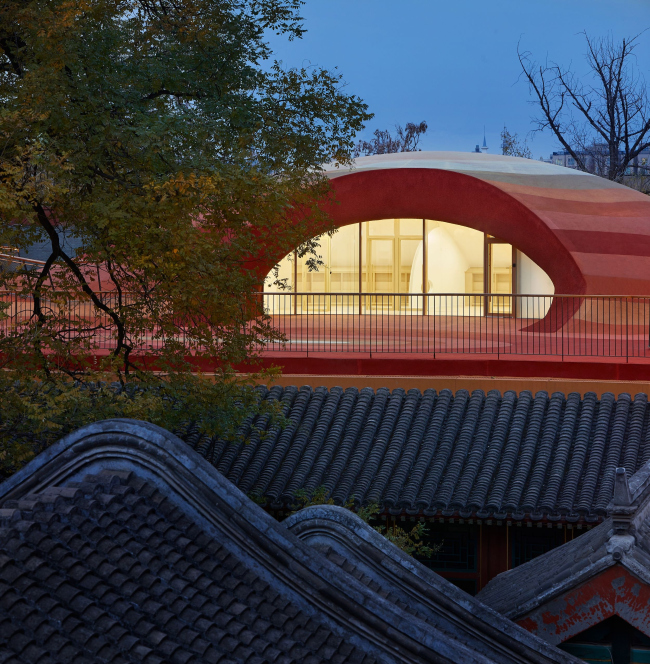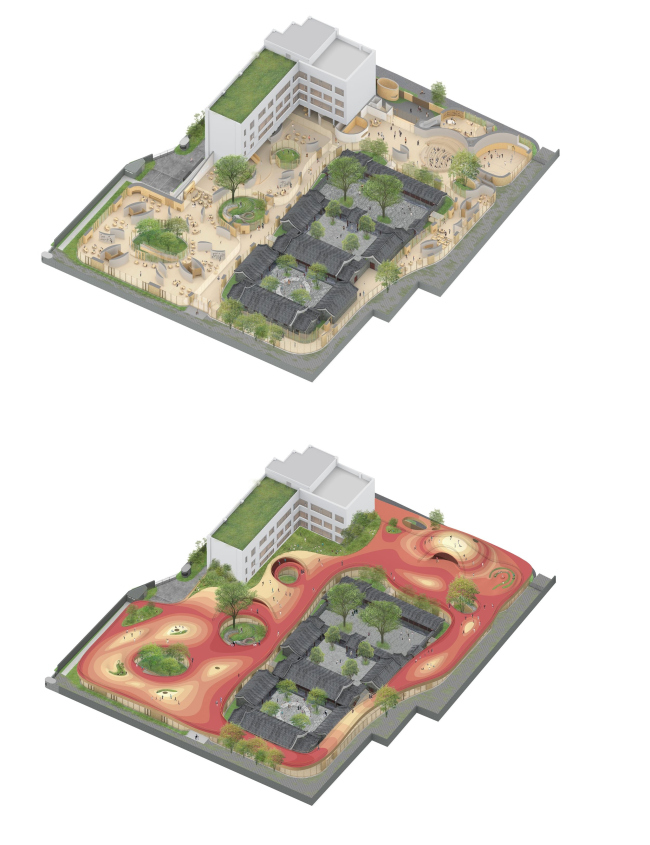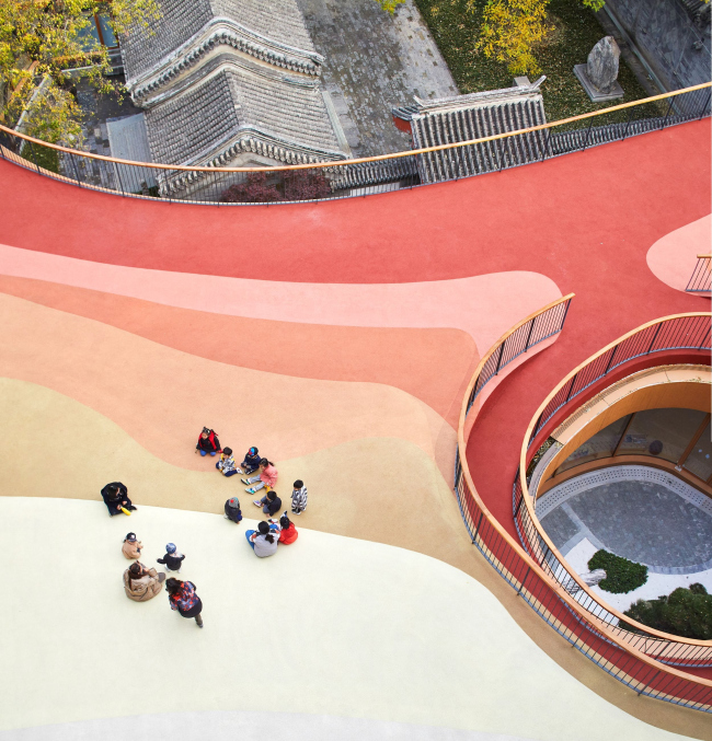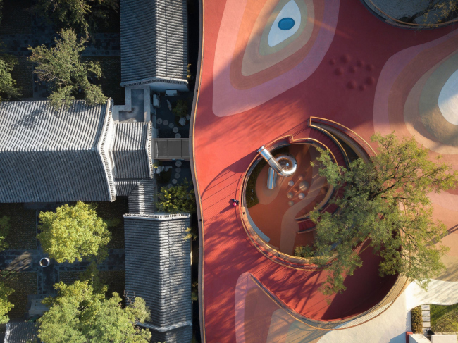 Идея кровли как героини проекта подсказана китайской детской поговоркой: «Если три дня не будешь наказан, крыша обвалится». «Обваливающаяся» кровля, где есть проемы и холмики, служит основным пространством для прогулок и занятий на свежем воздухе, в то время как на уровне земли места для этого сравнительно немного. Ее яркие цвета контрастируют с привычными для Пекина серым и синим тонами кирпича и черепицы: эта необычность должна расширить горизонт ребенка, побудить его думать и мечтать.