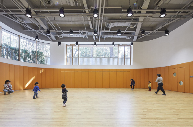 Одно из главных пространств – углубленный относительно уровня земли амфитеатр, поверху которого расположены стеллажи с книгами (их обилие – основа «политики» детского сада). За ним расположен двухсветный зал для занятий физкультурой, собраний или просто игр при плохой погоде.