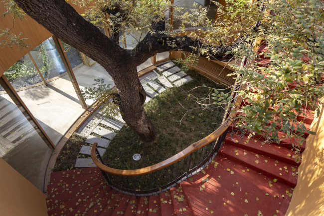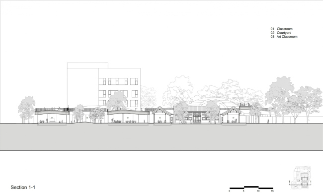 Новая часть контрастирует своей обтекаемой формой со строгой симметричной композицией усадьбы, однако и там, и там важнейшую роль играют внутренние дворы. Современное сооружение с помощью своих трех дворов огибает существовавшие на участке старые деревья. Кроме того, они обеспечивают интерьер светом и свежим воздухом, а детей – безопасным местом для игр. Но главное такое пространство – это крыша, куда из дворов ведут горки и лестницы.