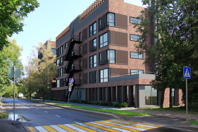 В качестве основного облицовочного материала выбрана керамическая плитка с фактурой красного кирпича. Кирпичные поверхности сочетаются с металлическими. Из металла выполнены решетки для кондиционеров, декоративные экраны возле окон, ограждения французских балконов, облицовка труб воздуховодов, а также пожарные лестницы, окрашенные в черный цвет и выведенные на фасад. Последний прием заставляет вспомнить не только о российских фабриках начала прошлого века, но и о жилых кварталах Нью-Йорка, для которых стальные пожарные лестницы с балконами стали своего рода визитной карточкой. К слову, краснокирпичные стены, так называемый brownstone, и большие окна вкупе с ажурными лестничными пролетами – классика нью-йоркской архитектуры.