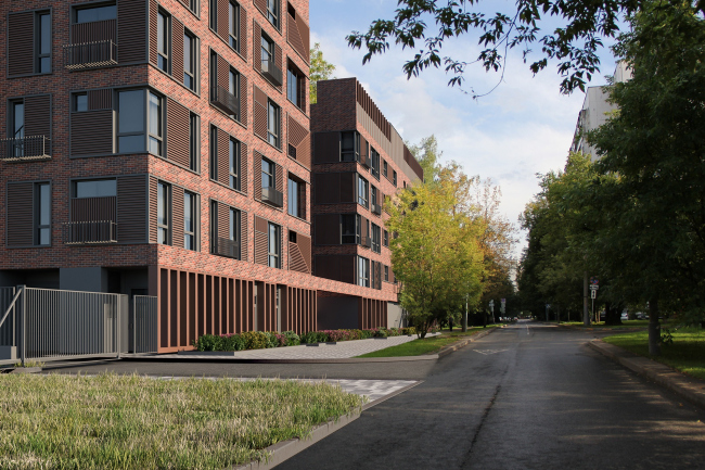 Проезд Досфлота – место тихое и зеленое, он повторяет траекторию изгиба канала и вполне сошел бы за лесную тропу, если бы не асфальтовое покрытие. Сюда выходит самый спокойный с точки зрения пластики и цвета фасад комплекса. Он поддерживает характер окружения и удачно вписывается в контекст по высоте, с понижением в сторону воды. Самая акцентная деталь комплекса с этого ракурса – декоративная металлическая пергола на кровле, окрашенная в тон фасадной плитки. Предполагается, что в этой части кровля будет эксплуатируемой. Эта благоустроенная зона под навесом станет дополнительным местом отдыха для жильцов, что актуально, учитывая дефицит дворового пространства.