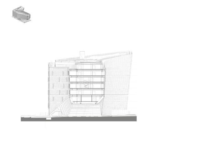 Этот подход аналогичен решению фасада, который с помощью 20 000 панелей-«пикселей» из стекла разной степени прозрачности должен напоминать типографский текст, слегка нечеткий, лучше всего узнаваемый издалека. Эта отсылка к все никак не исчезающей бумажной печати кажется анахронизмом – но также и важным знаком привычного в меняющемся мире.