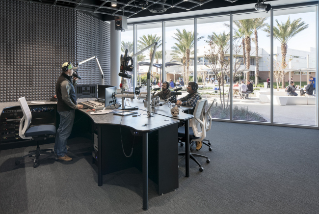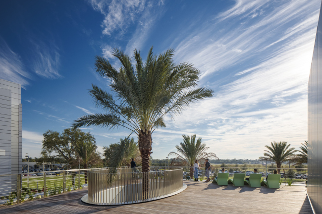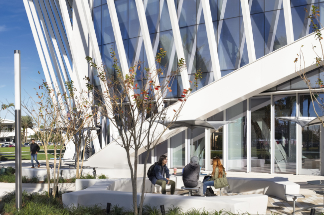 Открытая терраса на втором уровне позволяет студентам беспрепятственно наблюдать за ракетами, которые запускает Космический центр Кеннеди у мыса Канаверал – он находится в ста километрах от вуза, – и самолетами на взлетно-посадочной полосе аэропорта, вплотную примыкающего к кампусу.