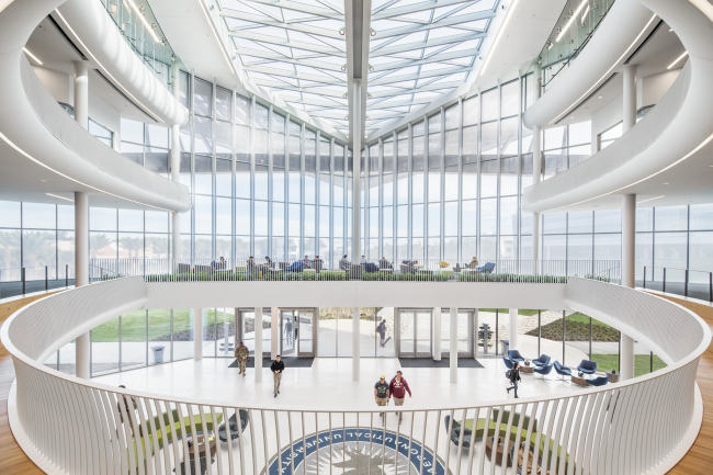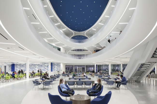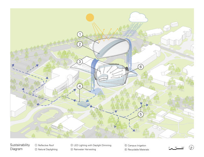 Центральное ядро здания решено в виде открытого атриума высотой 60 метров. Зенитный фонарь, протянутый вдоль всей крыши, обеспечивает естественное освещение помещений, главным образом библиотеки. При этом непрозрачная светоотражающая оболочка, занимающая большую часть кровли, защищает студентов от негативного воздействия жаркого солнца Флориды.