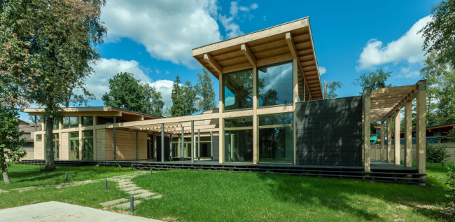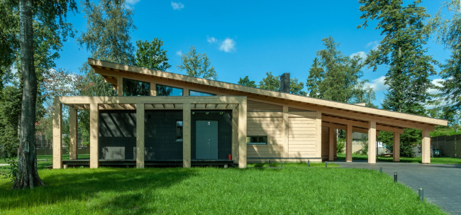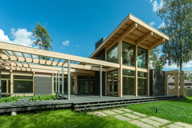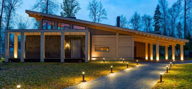 Помимо этого, очень интересным приемом архитектор как бы отрывает скат крыши от первого, деревянного, яруса и поднимает его вверх, как трамплин, над вторым стеклянным ярусом. Вообще, Роман Леонидов любит эту авангардную форму взлетающей крыши, пришедшую к нам из ХХ века, нечто подобное есть и в других его постройках, например в доме Cool House. Особенно выразительно данный прием применен на въездном фасаде. Перед нами сплошная деревянная диагональ кровли, – плоскость, которая начинается невысоко от земли и постепенно набирает высоту. В правой части она служит навесом для автомобилей, в левой она минует обобщенный деревянный портик над главным входом и взмывает ввысь над стеклянным вторым ярусом.
