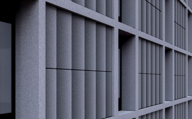 Проект фасадных решений с использованием LAMINAM Space DOTS. Для заполнения некоторых глухих поверхностей применяется материал с текстурой DOTS H50100, что позволяет создать оптическую иллюзию объемных элементов, в данном случае ряда колонн-каннелюр. Для остальных поверхностей выбраны две текстуры светло-серая и темно-серая. Фасад представляет собой объемную сетку из поясов и пилонов.