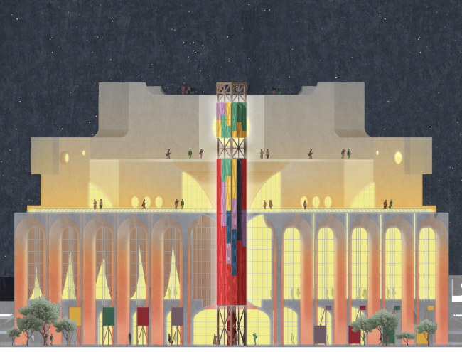 В основе концепции – идея «тотального театра» Владимира Сомова. Архитекторы создают эффект сценического пространства по всему зданию и за его пределами. Архитектура тоже приобретает характер сценической декорации – авторы отдают предпочтение модульным решениям, в том числе временным, которые становятся воплощением театральной сути. Внутренние границы в здании стираются, все уровни связаны по вертикали, что оставляет свободу для творческой интерпретации пространства.