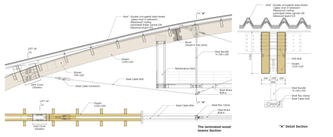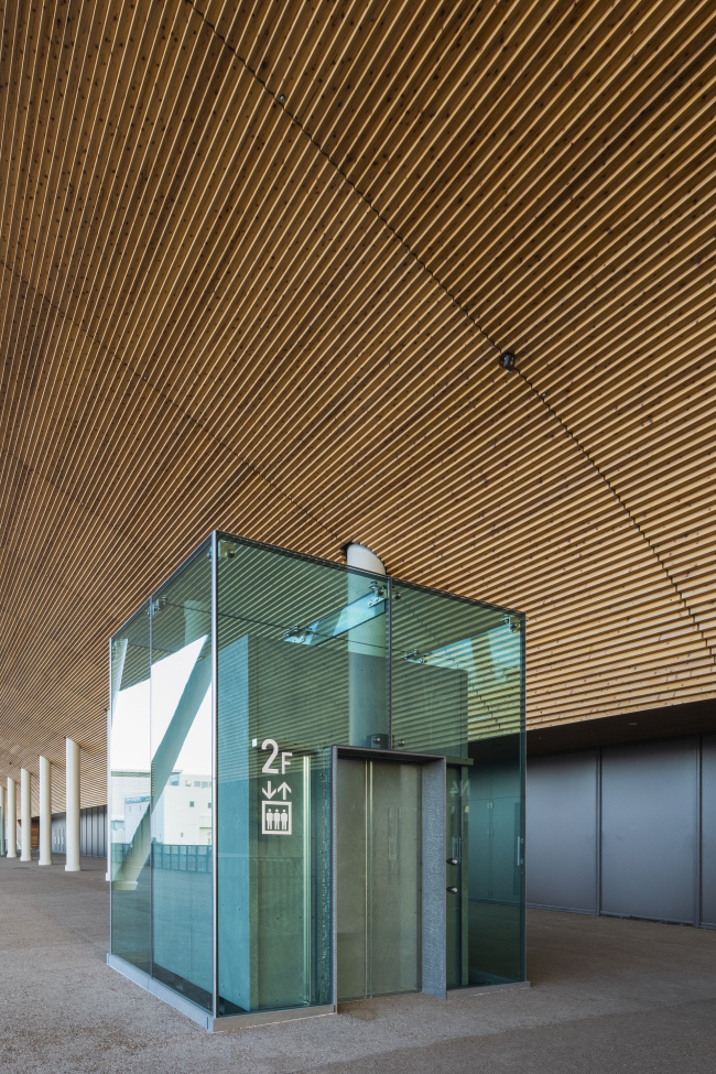 Архитекторы опирались на традиции деревянного зодчества Японии, но при этом экспериментировали с несущей конструкцией кровли, выбрав, помимо прочего, для нее монолитные балки из клееного бруса вместо более мелких деталей. Такое решение более пожаробезопасно и в прямом смысле устойчиво.