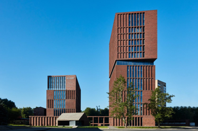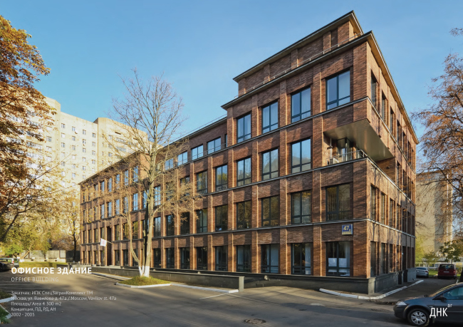 Так, бизнес-центр на улице Вавилова в окружении разновременной застройки получил четкий регулярный фасад при асимметричном скульптурном объеме с миксом из трех тонов кирпича.