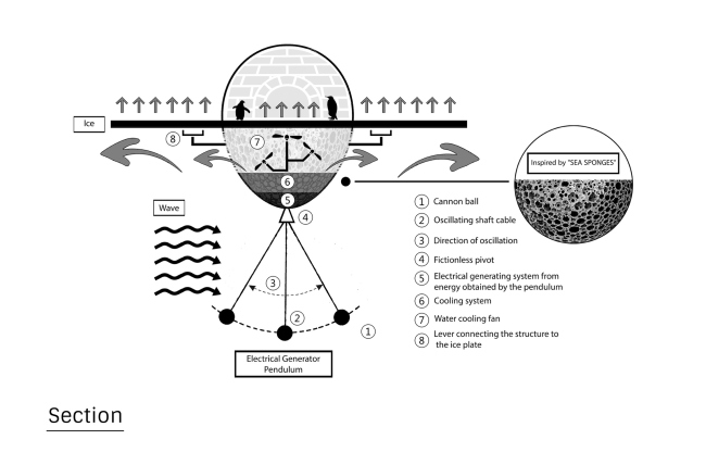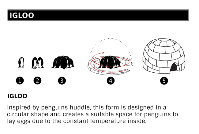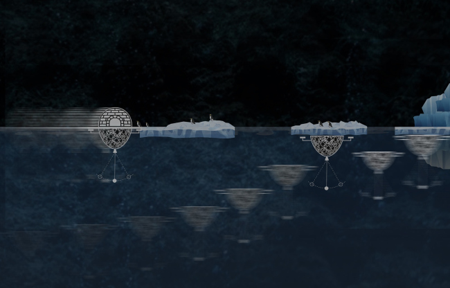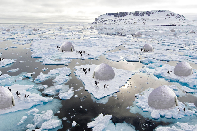 Из-за глобального потепления императорские пингвины, живущие на шельфовых ледниках Антарктиды, оказались под угрозой вымирания. Ледяной покров постепенно тает и истончается, и птицы теряют свою естественную среду обитания. Если выбросы углекислого газа не сократятся, то к 2100 году популяция императорских пингвинов сократится на 80%. Иранский архитектор Саджад Навиди предложил размещать на льдинах Антарктиды специальные двухчастные жилища, предназначенные для спасения этих крупных птиц – в первую очередь, сохранения их места обитания – льдин. Отметим, что проект Саджада Навиди вышел в финал архитектурного конкурса, организованного Фондом Жака Ружери.