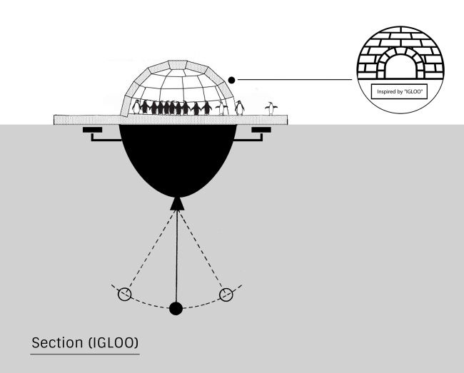 Система защиты императорских пингвиновИзображение предоставлено Саджадом НавидиСистема защиты императорских пингвиновИзображение предоставлено Саджадом НавидиСистема защиты императорских пингвиновИзображение предоставлено Саджадом Навиди Прообразом для надземной части системы послужило типичное жилище эскимосов – иглу. Под ледяным куполом императорские пингвины, привыкшие сбиваться в плотные группы, чтобы согреться, смогут прятаться от непогоды.Система защиты императорских пингвиновИзображение предоставлено Саджадом Навиди