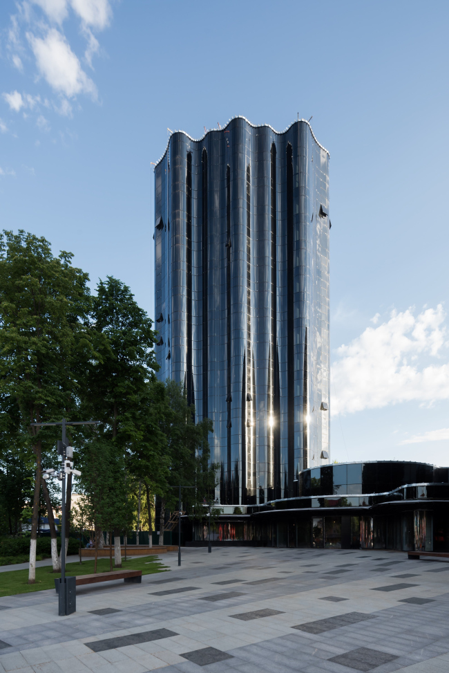 «Стекающая нефть ― задумка архитекторов проекта башни, ― говорит руководитель архитектурного направления Guardian Glass Татьяна Бондарева. ― Чтобы достичь такого визуального эффекта, придать стеклу и зданию плавные очертания, применяли моллирование или «гнутье» стекла. Уникальность в том, что стекло гнули не только по «стеклянной» стороне, но и по стороне с покрытием, и это было очень сложной задачей для производителя стеклопакетов «Мосавтостекло» и фасадной компании «Фортэкс», проявивших высокое мастерство в работе над этим сложным проектом. Его успех основан на высоком качестве используемого материала, большом профессионализме и технических возможностях наших партнеров».