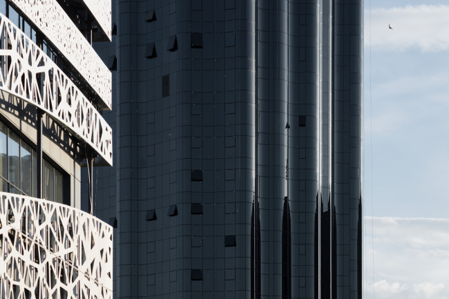 Наверное , самый сложный элемент фасада – это стеклопакет с моллированием, который состоит из триплекса и еще 2-х видов стекла. Триплекс сделан из тонированного в массе стекла производства компании AGC и солнцезащитного стекла с магнетронным напылением Guardian SunGuard HD Silver Grey 32. Такое сочетание продуктов использовалось для того, чтобы достичь нужного визуального эффекта – стекающей нефти, который был заложен в концепцию задания архитектурным бюро Арканика. При этом в стеклопакете присутствует стекло Guardian СlimaGuard Premium T+, отвечающее за теплосбережение, и стекло Guardian Extra Clear. Таким образом, стеклопакет на данном проекте, выполняет не только эстетическую функцию, но и может помочь сохранить тепло в помещении и защитить от солнца.