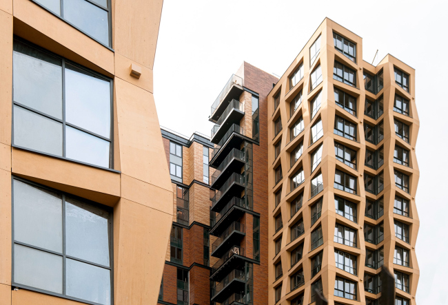 Фасады жилого комплекса декорированы песочными и терракотовыми панелями из фиброцемента, имитирующими дерево, благодаря чему здание кажется естественным продолжением ландшафта.