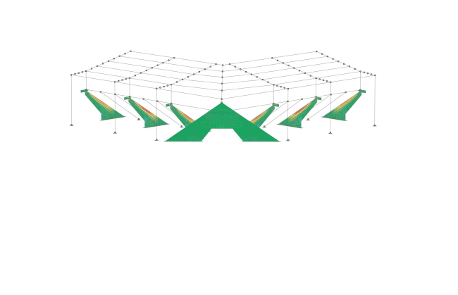 Пластическую выразительность сооружению придает использование бетона: из него выполнены собственно углы, зрительно объединенные бетонным же цокольным этажом. Сверху они соединены с кольцевыми фермами, завершающими конструкцию стадиона, помогая им выдерживать нагрузку.